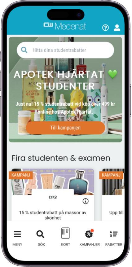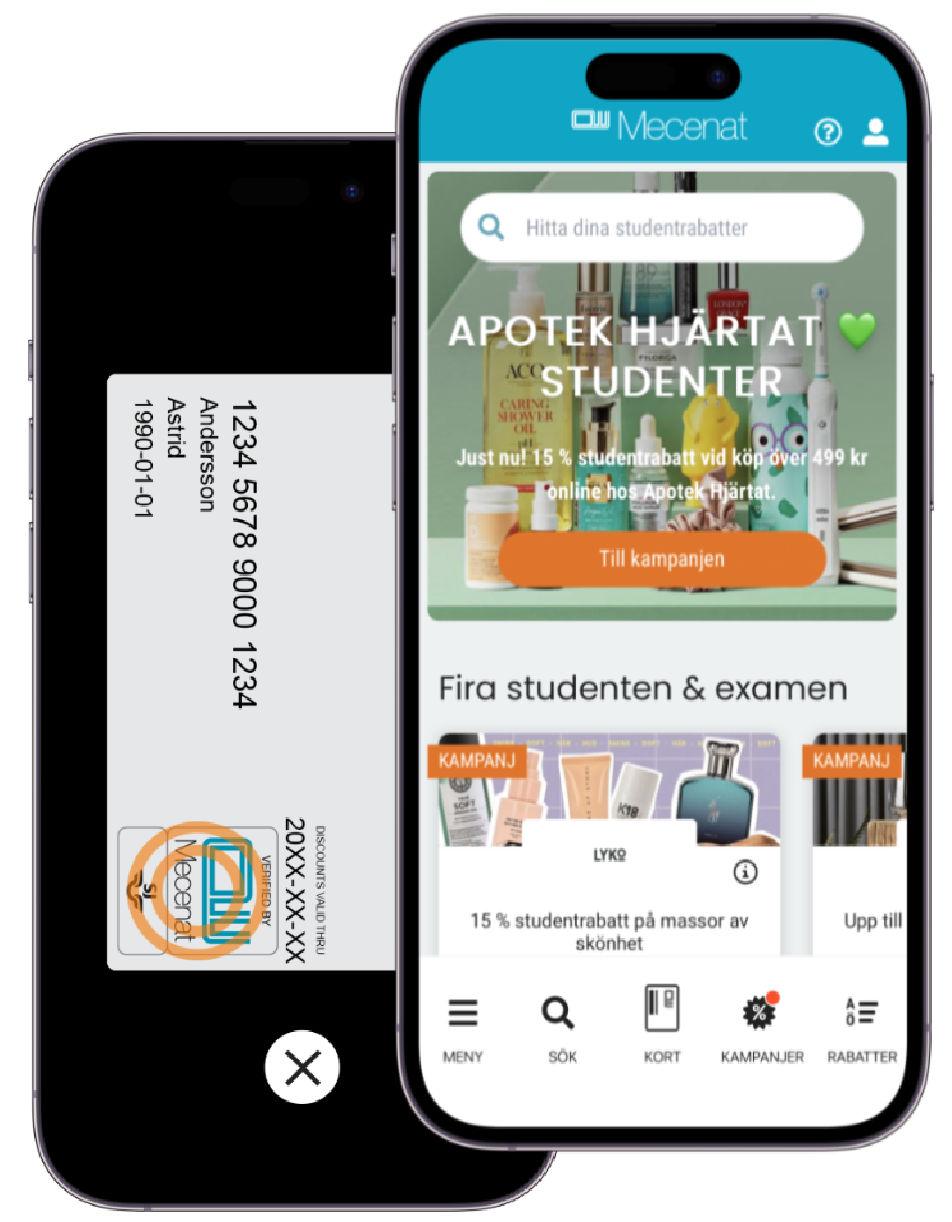 Ladda ner Mecenat-appen så har du alltid ditt Mecenatkort, dina berättigande reserabatter och alla dina studentrabatter med dig.